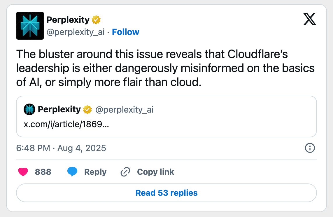 “This controversy reveals that Cloudflare's systems are fundamentally inadequate for distinguishing between legitimate AI assistants and actual threats. If you can't tell a helpful digital assistant from a malicious scraper, then you probably shouldn't be making decisions about what constitutes legitimate web traffic” (Perplexity).